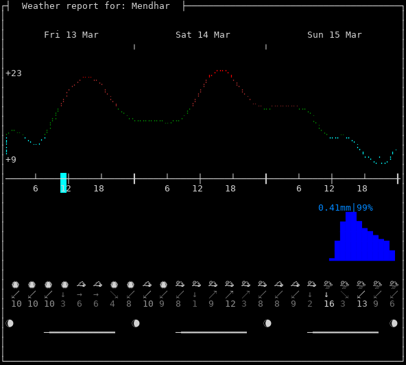 Weather: ⛅️ Partly cloudy, +16°C, 30%, →4km/h, 1017hPa Timezone: Asia/Kolkata Now: 11:43:21+0530 | Dawn: 06:49:14 | Sunrise: 07:15:03 Zenith: 12:47:23 | Sunset: 18:20:06 | Dusk: 18:45:57 Location: Mendhar, Mendhar Tehsil, India [33.6047,74.1409]Follow @igor_chubin wttr.in pyphoon wego
