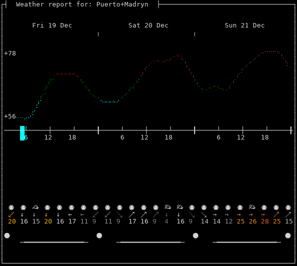 Weather: ☀️ Sunny, +61°F, 63%, ←20mph, 1009hPa Timezone: America/Argentina/Catamarca Now: 20:41:04-0300 | Dawn: 05:02:16 | Sunrise: 05:38:05 Zenith: 13:17:23 | Sunset: 20:57:23 | Dusk: 21:33:13 Location: Puerto Madryn, Departamento Biedma, CHB, Argentina [-42.7291,-65.1059]Follow @igor_chubin wttr.in pyphoon wego