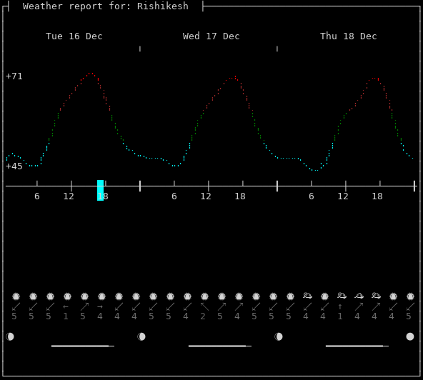 Weather: ☀️ Sunny, +52°F, 28%, ↙3mph, 1016hPa Timezone: Asia/Kolkata Now: 08:04:12+0530 | Dawn: 06:39:13 | Sunrise: 07:06:07 Zenith: 12:12:17 | Sunset: 17:18:40 | Dusk: 17:45:34 Location: Rishikesh, Pauri Garhwal, Uttarakhand, 249201 [30.1073,78.3020]Follow @igor_chubin wttr.in pyphoon wego