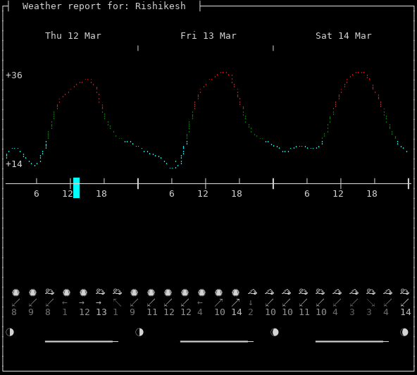 Weather: ☀️ Clear, +4°C, 38%, ↙8km/h, 1016hPa Timezone: Asia/Kolkata Now: 05:05:26+0530 | Dawn: 06:47:31 | Sunrise: 07:13:53 Zenith: 12:26:01 | Sunset: 17:38:34 | Dusk: 18:04:56 Location: Rishikesh, Pauri Garhwal, Uttarakhand, 249201 [30.1073,78.3020]Follow @igor_chubin wttr.in pyphoon wego