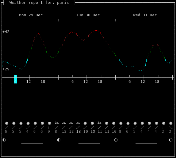 Weather: ☀️ Clear, +29°F, 93%, ↙5mph, 1025hPa Timezone: Europe/Paris Now: 03:31:56+0100 | Dawn: 08:06:23 | Sunrise: 08:44:14 Zenith: 12:52:29 | Sunset: 17:01:20 | Dusk: 17:39:11 Location: Paris, Île-de-France, France métropolitaine [48.8565,2.3518]Follow @igor_chubin wttr.in pyphoon wego